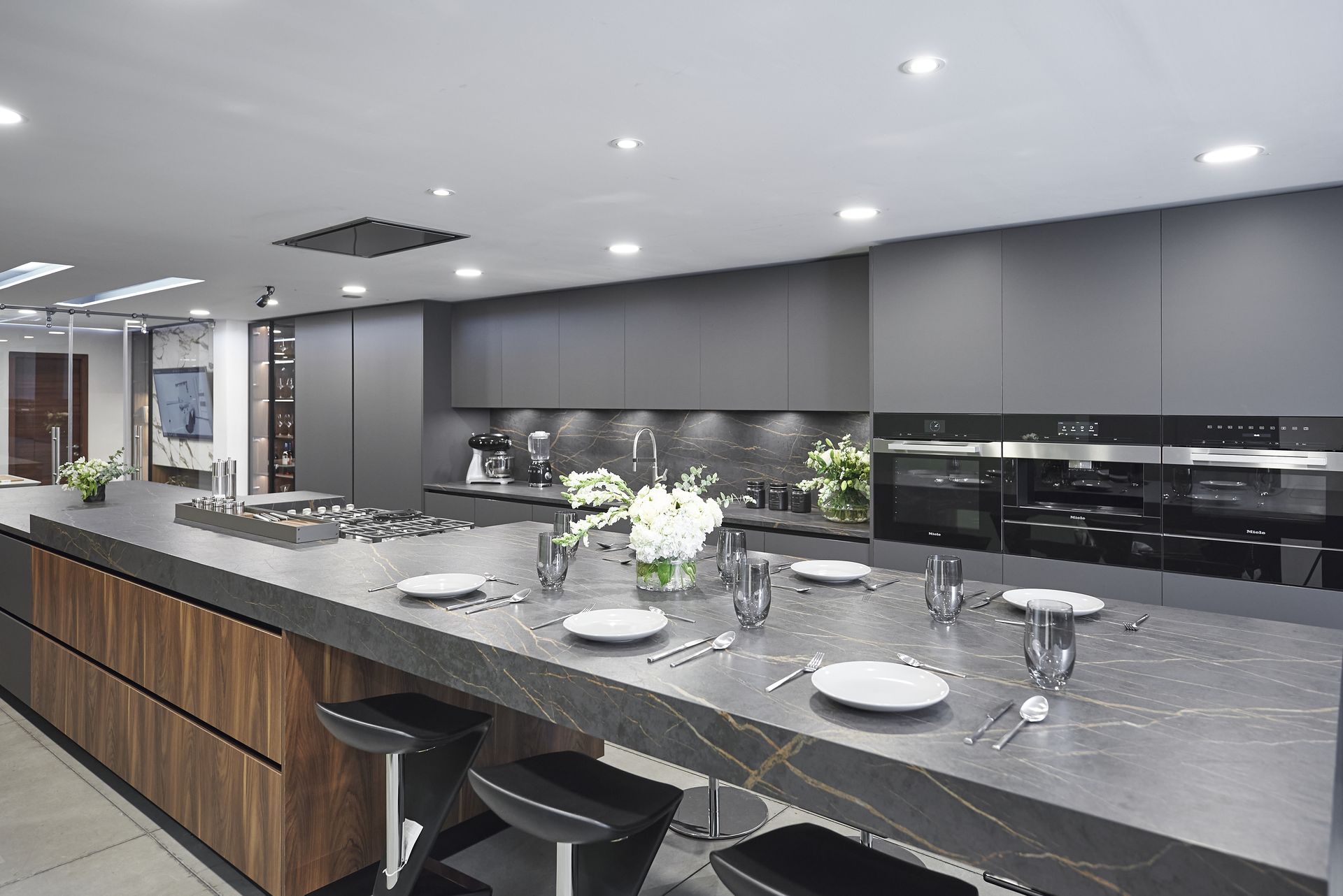 Elegancia y resistencia en una cocina integral moderna con isla y otras opciones.