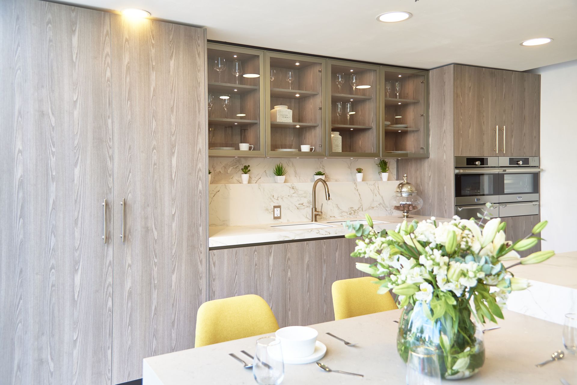 Estilo moderno con jaladeras tipo Gola fabricadas del mismo material que los frentes, integrando diseño y funcionalidad.